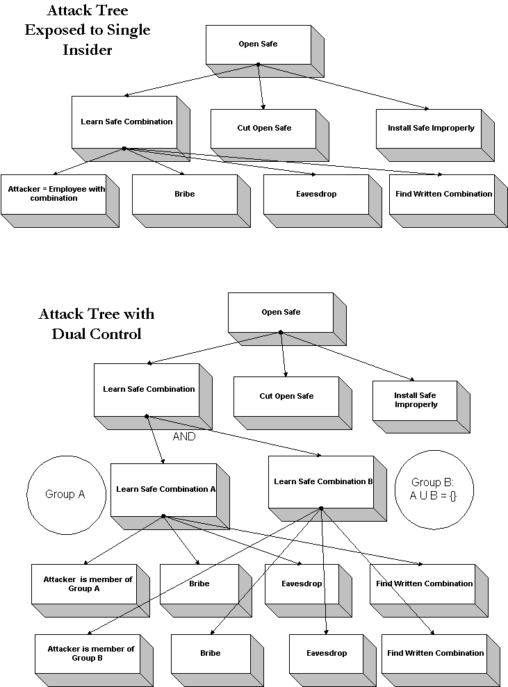 Note that not only does our dual control address the "Employee = Attacker" node we added; the dual control also strengthens security against the other subnodes of "Learn Combination". This will be the case when the attacker must now attack each group indepdenently. In the safe combination the independence is great but not complete—Alice eavesdropping on careless Bob shows that there is still some vulnerability from having members of A and B operate in close proximity.