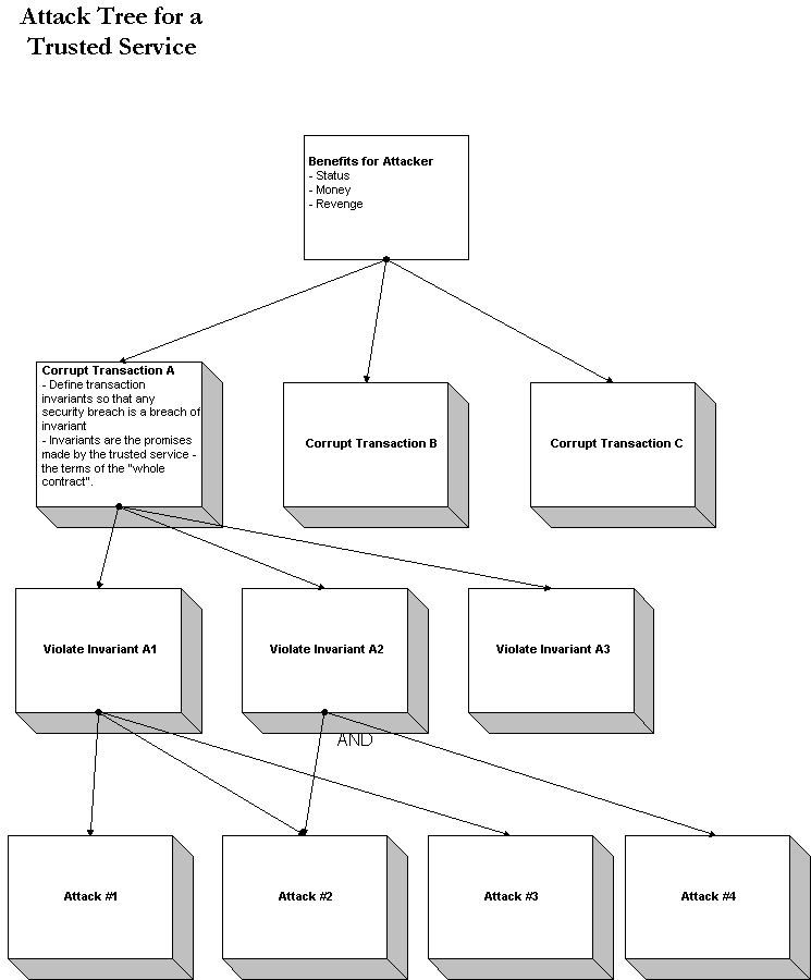 Bruce Schneier has developed a methodology called "attack trees" for analyzing and designing security. These are described in Chapter 21 of his new book, Secrets and Lies, and also the Dr. Dobbs article on attack trees. This author has invented a methodology, for using attack trees to analyze the controls needed to implement trusted services.
